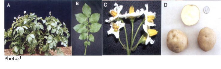 Tubers– Round, small to medium size with smooth, light buff colored, netted skin1,2; white flesh; six to nine shallow to medium deep, evenly distributed eyes per tuber; medium specific gravity; medium to late tuber dormancy1